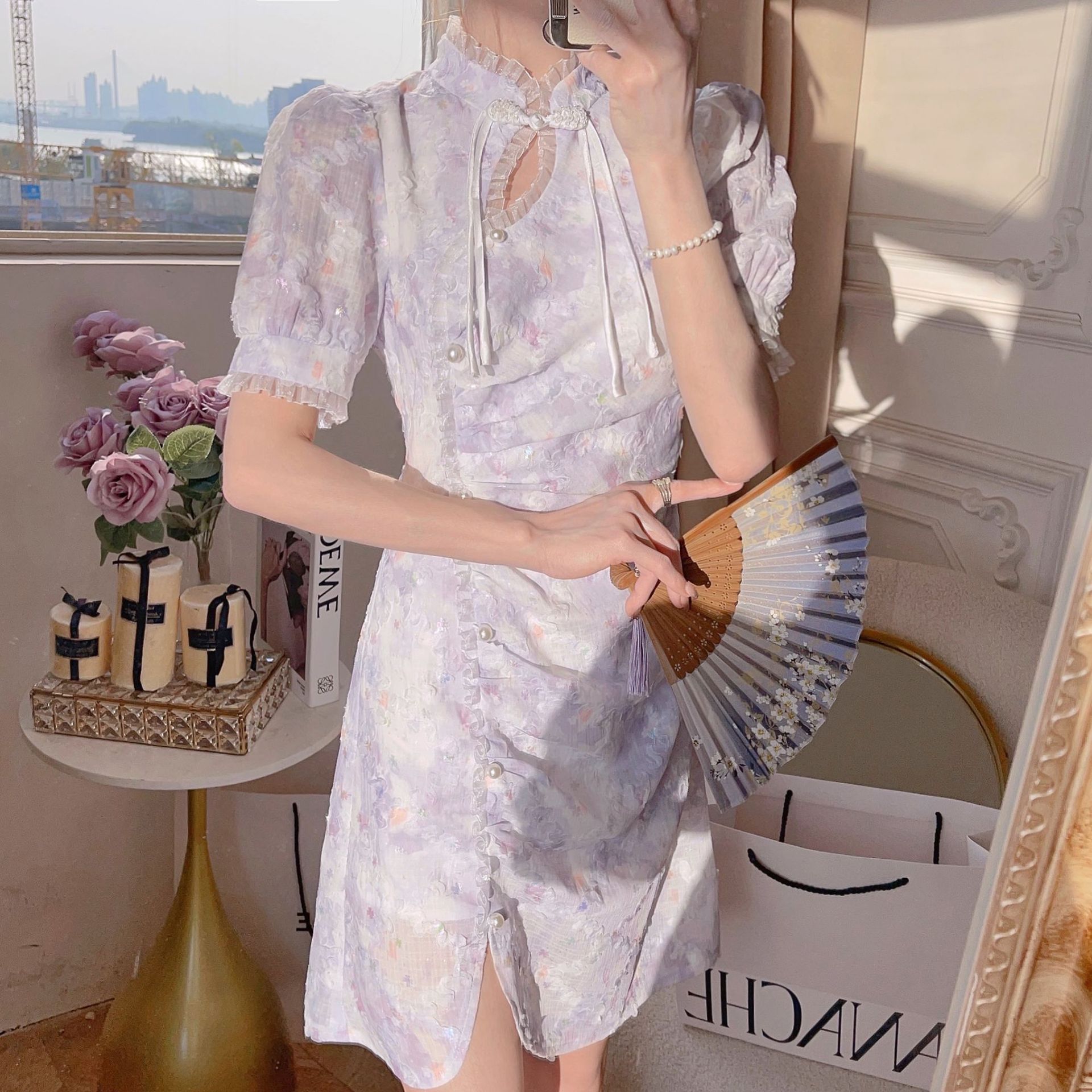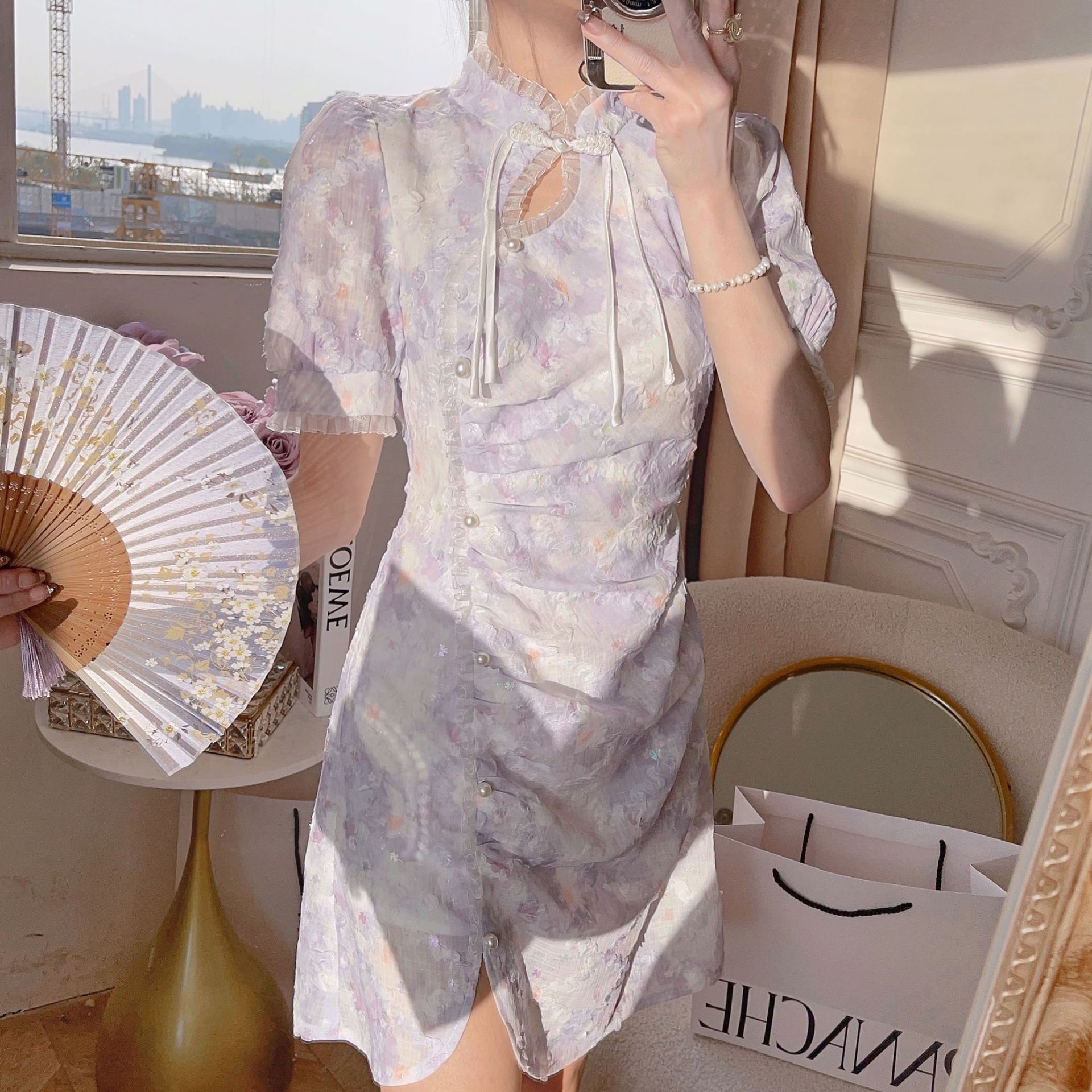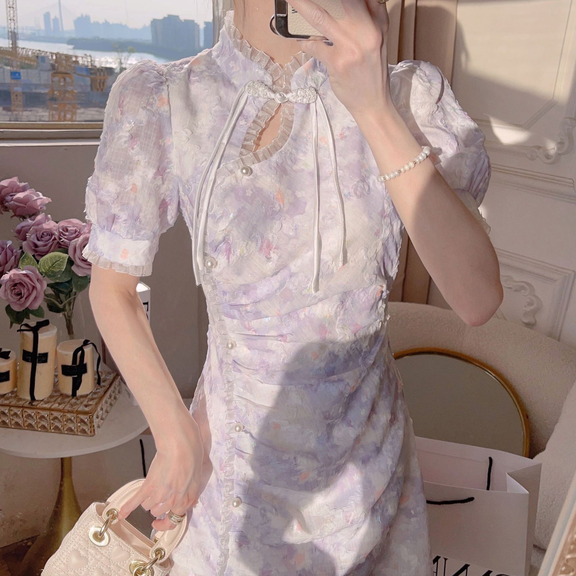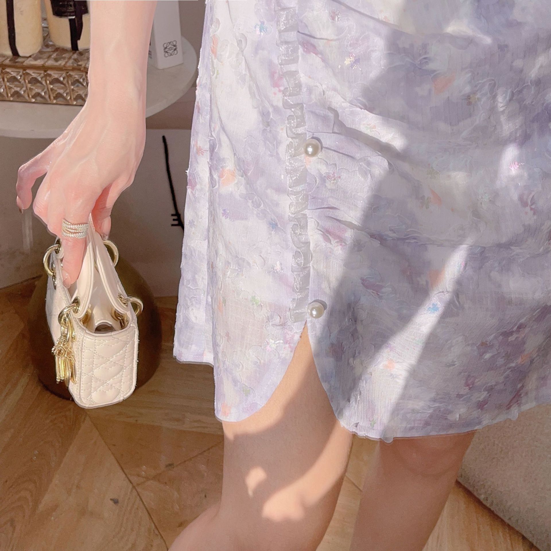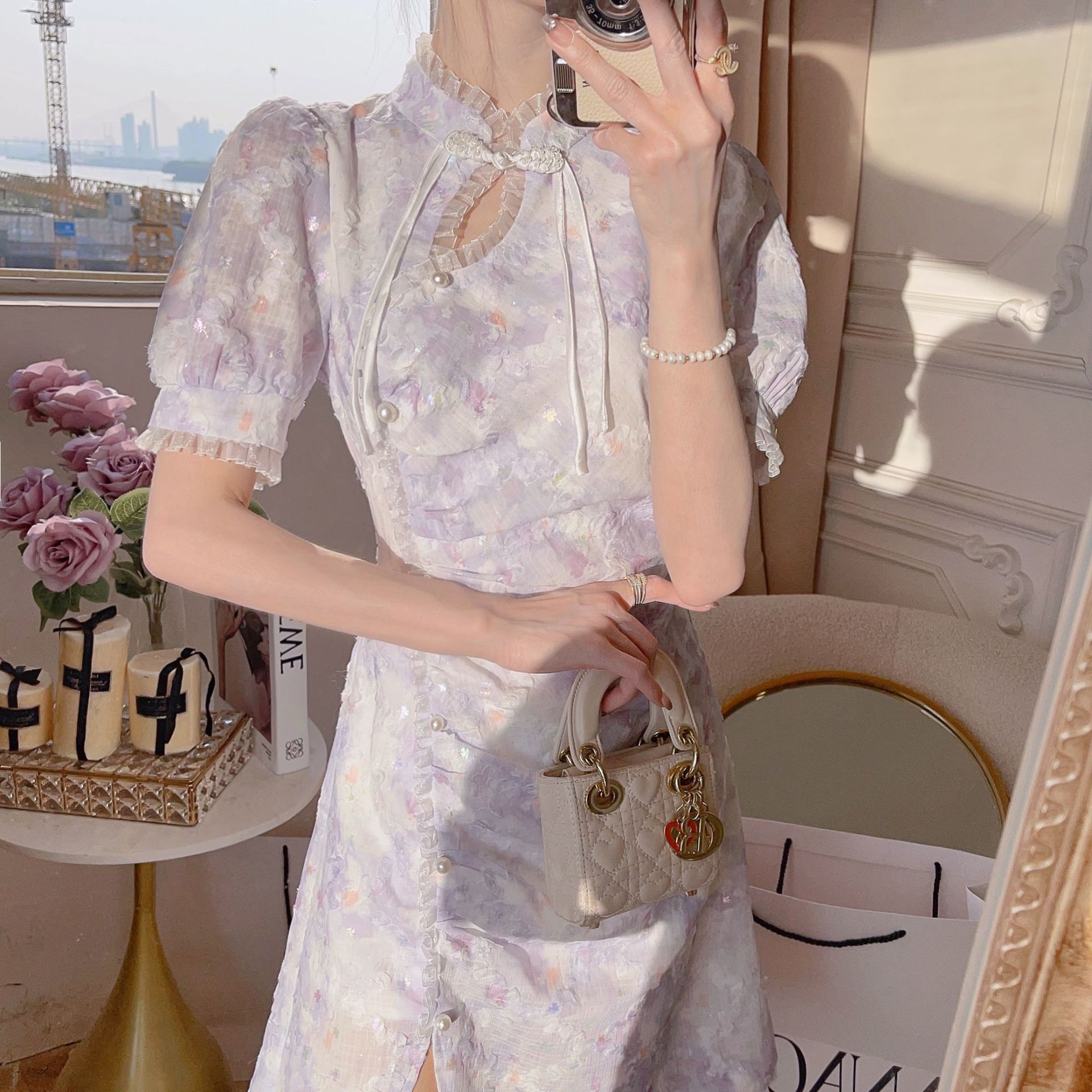 Váy sườn xám cải tiến theo phong cách triều đình Pháp, màu sắc tranh sơn dầu, dành cho nữ, kiểu mới mùa hè 2025