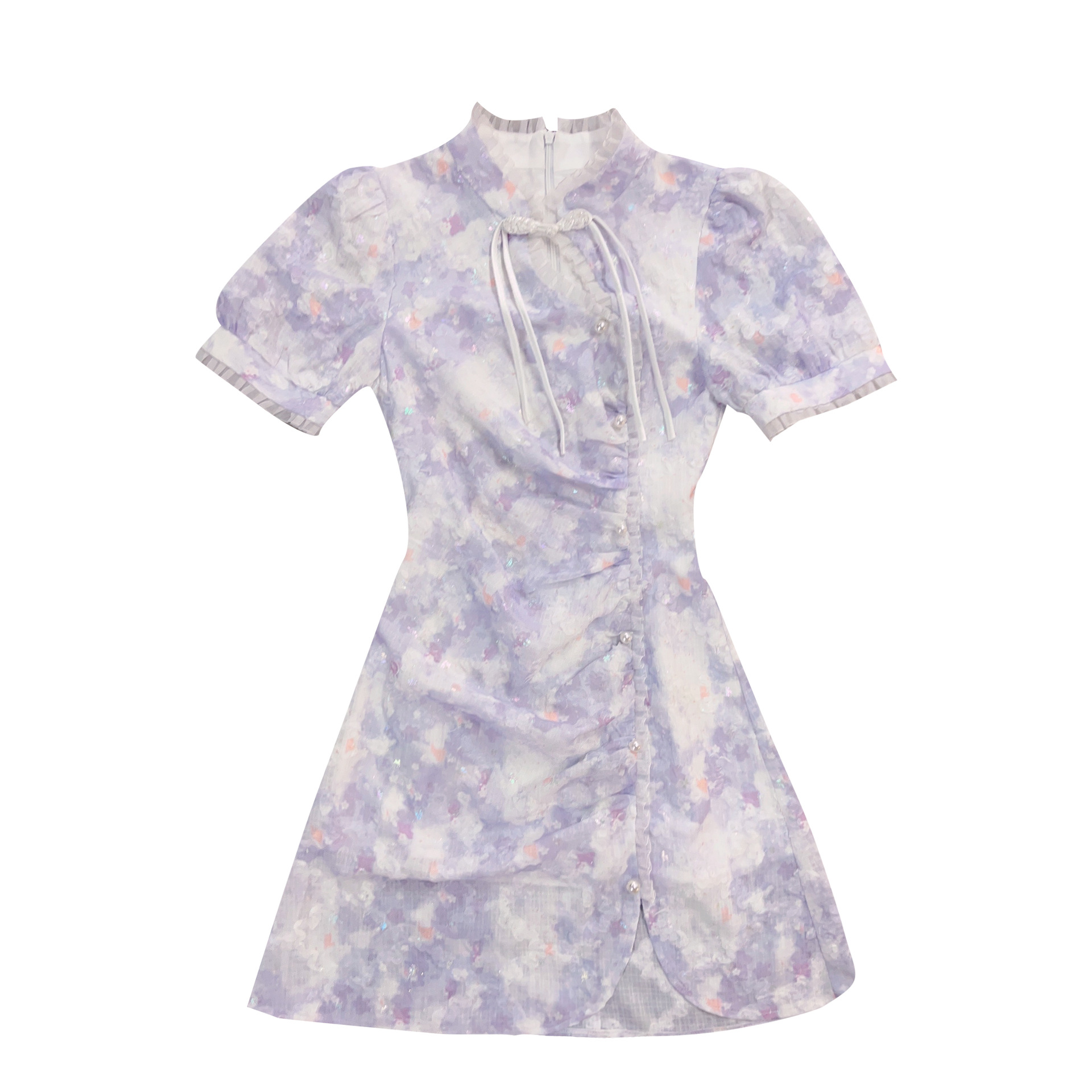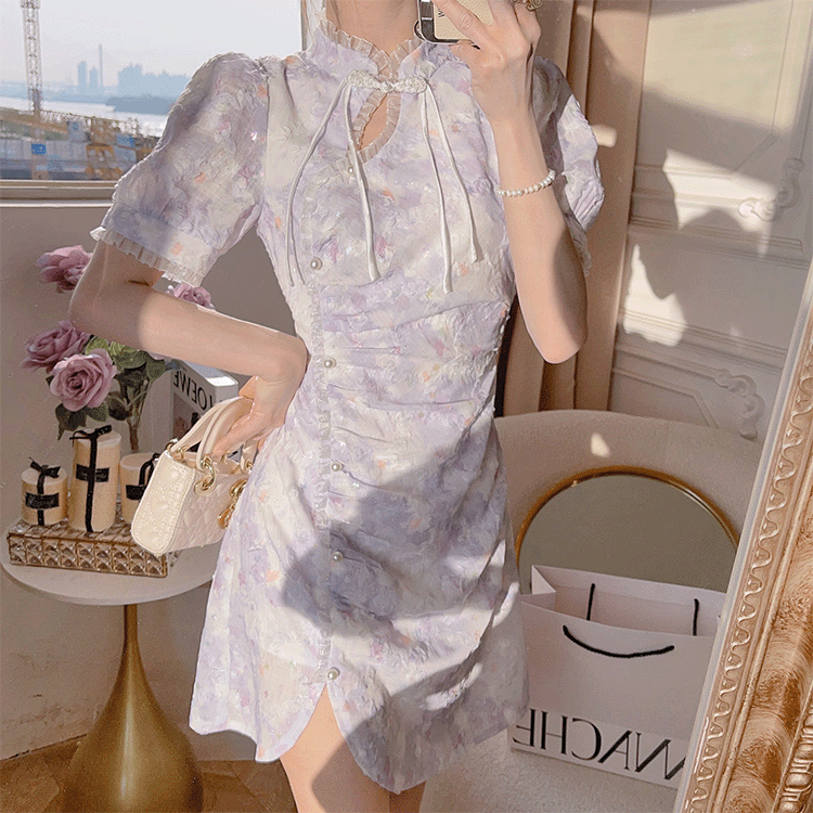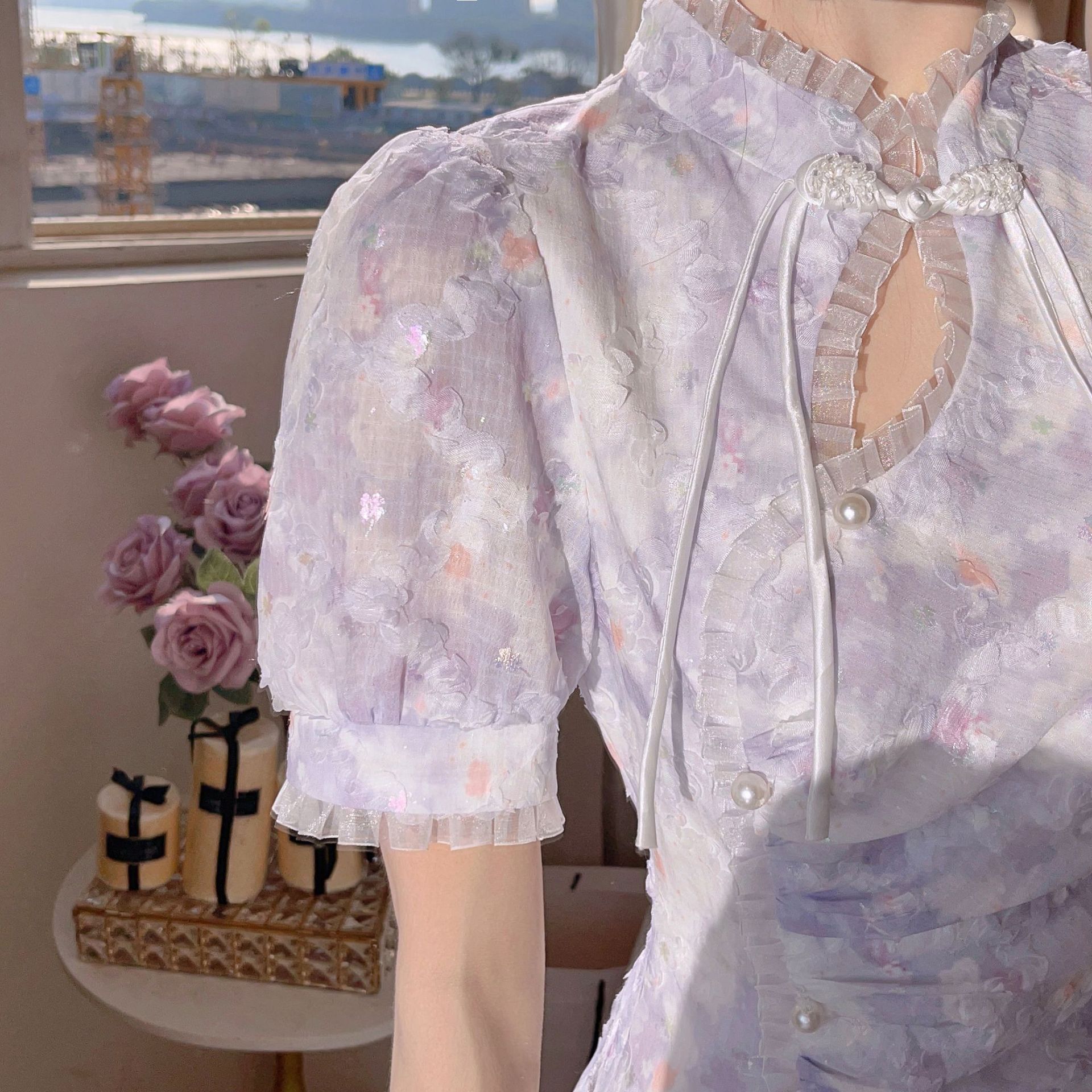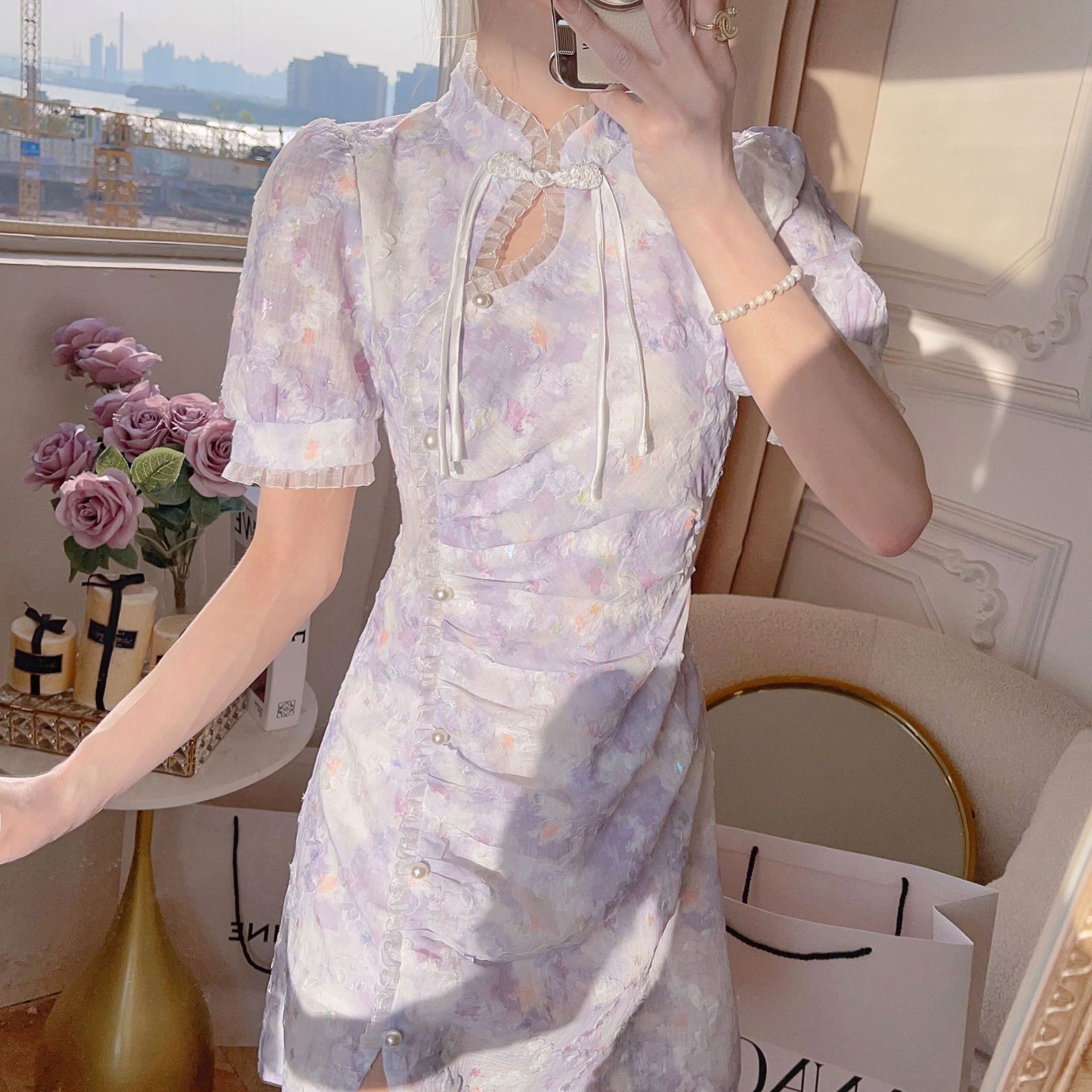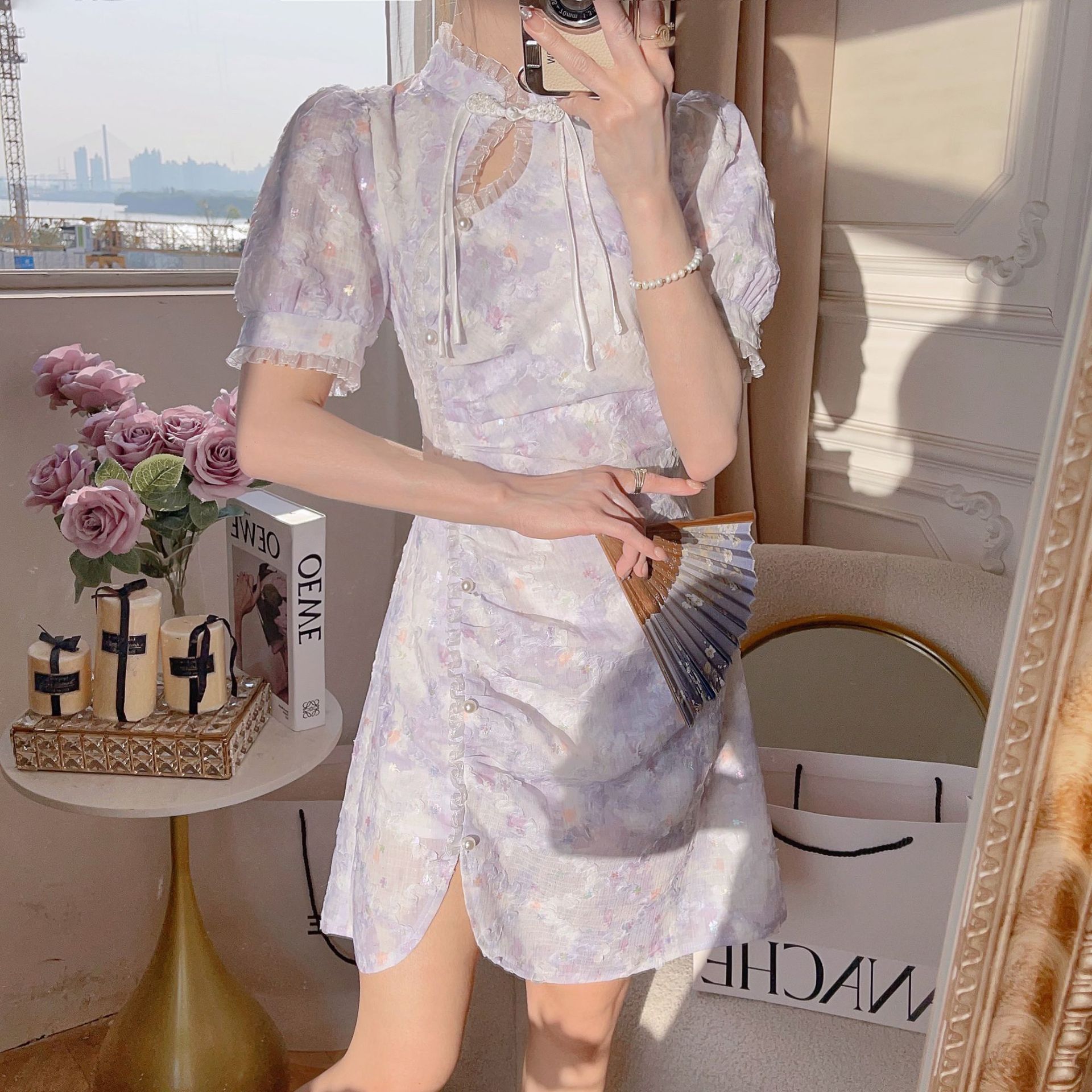 Váy sườn xám cải tiến theo phong cách triều đình Pháp, màu sắc tranh sơn dầu, dành cho nữ, kiểu mới mùa hè 2025
